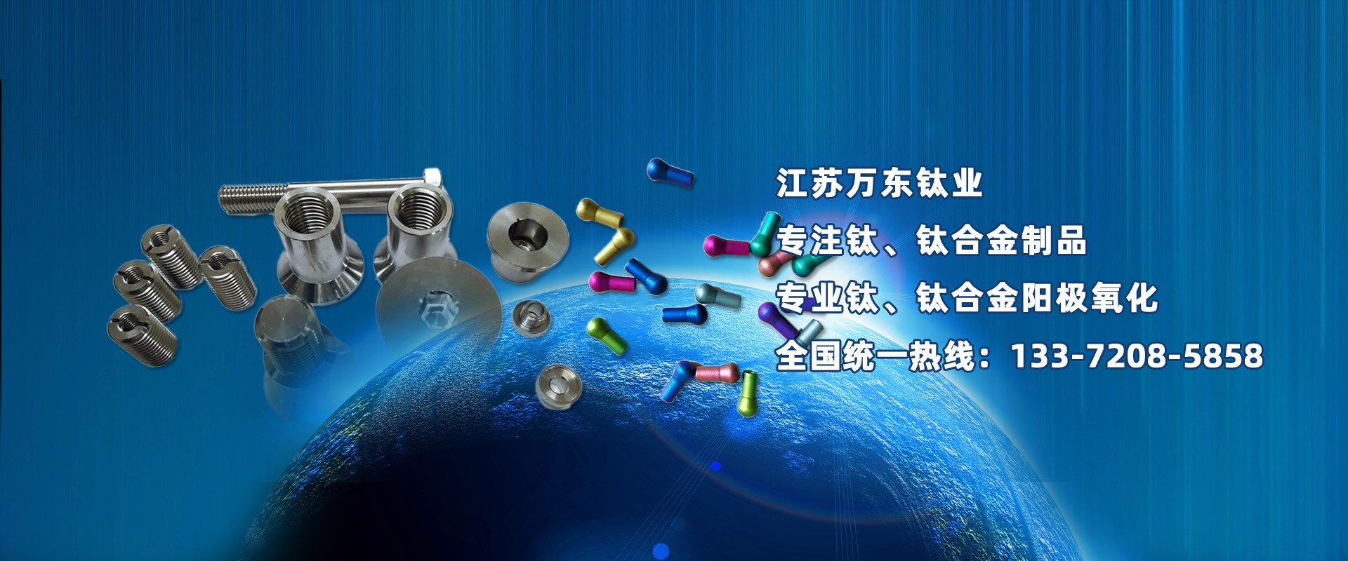 江蘇萬(wàn)東鈦業(yè)科技有限公司坐落于中國(guó)江蘇省南通市,擁有28年的鈦合金研發(fā)技術(shù),公司專業(yè)從事:鈦陽(yáng)極氧化、鈦合金陽(yáng)極氧化、脈沖氧化。鈦合金緊固件生產(chǎn):M0.6以上高品質(zhì):螺絲、螺母、螺柱、螺套、可根據(jù)用戶的特殊要求定制。